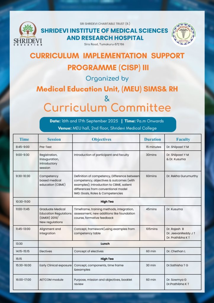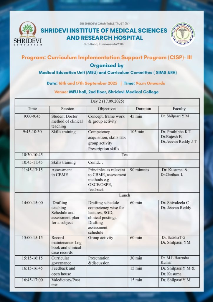 The two days Curriculum Implementation Support Program (CISP) III was conducted on 16th and 17th September 2025 in the Institute by Curriculum committee with the support of Medical Education Unit ( MEU). Dr.Aswin Kumar was nominated by NMC as observer to the program. The designated faculties of SIMS &RH actively participated in the program with good interaction with the resource persons for effective implemention of CBME inthe Institute. The organizing committee thank managment and administration for providing all the support and cooperation for successful conduct of the program.