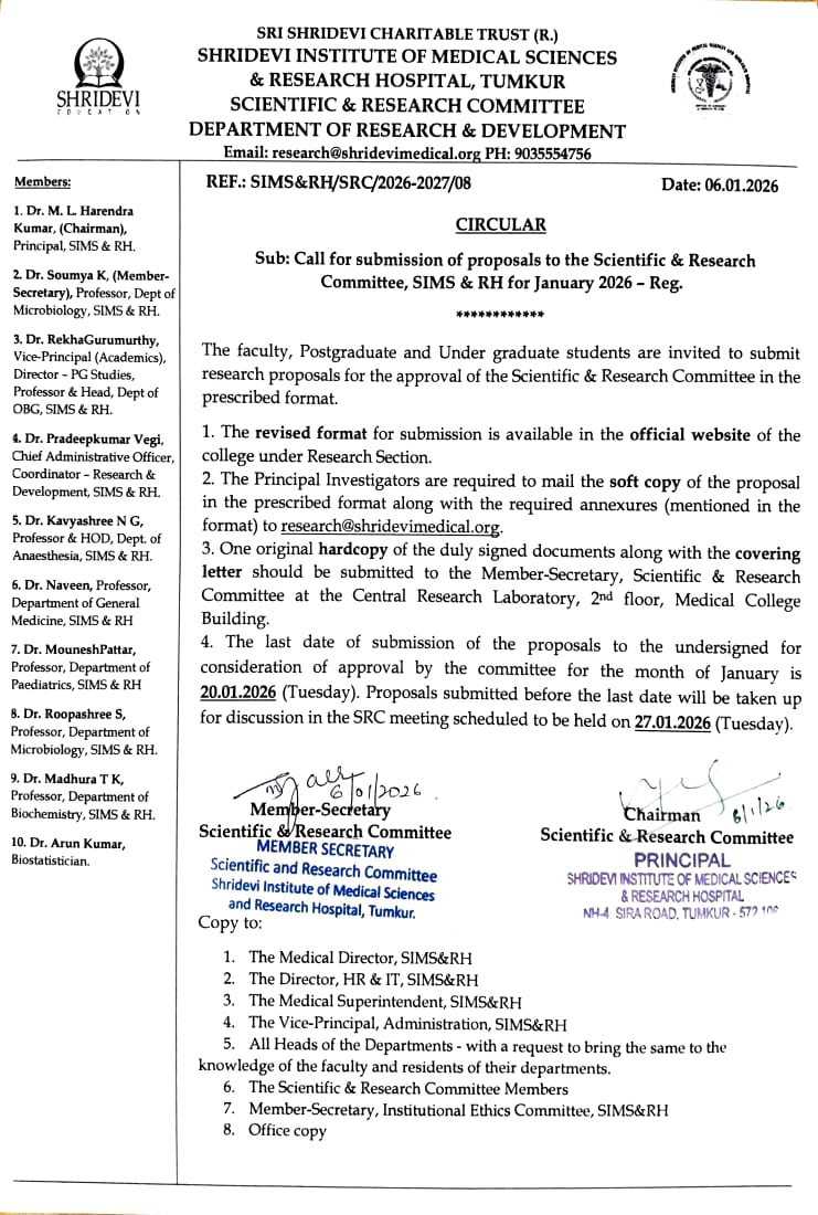 The Scientific and Research Committee (SRC) was constituted to improve the quality of research undertaken in Shridevi Institute of Medical Sciences & Research Hospital, Tumakuru and to encourage students and staff of the various departments to publish in reputed journals. The research proposals generated at SIMS&RH need to have the approval of the Scientific and Research Committee before being submitted to the Ethics Committee. After the approval of the SRC, the proposals are referred to the Ethics Committee for consideration.